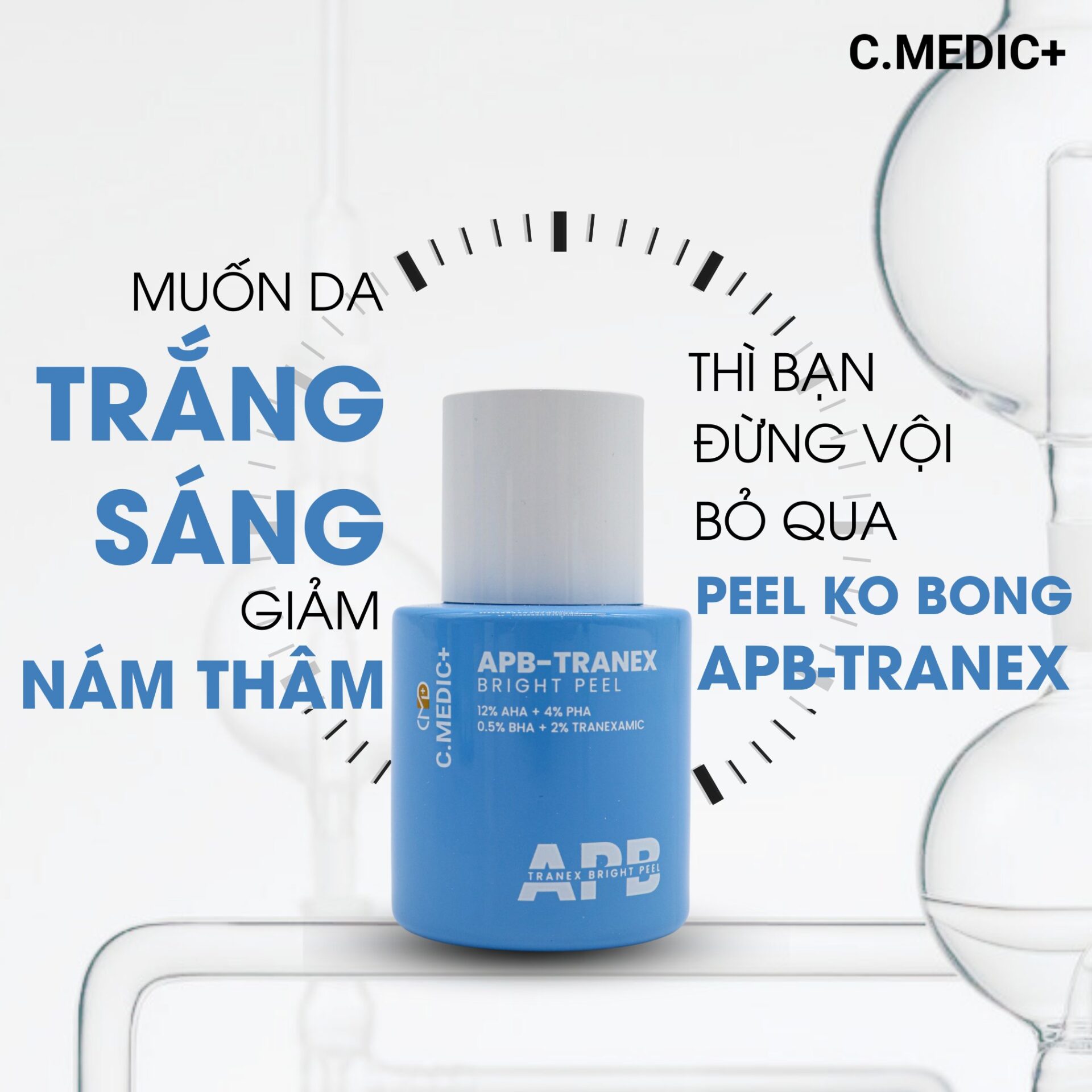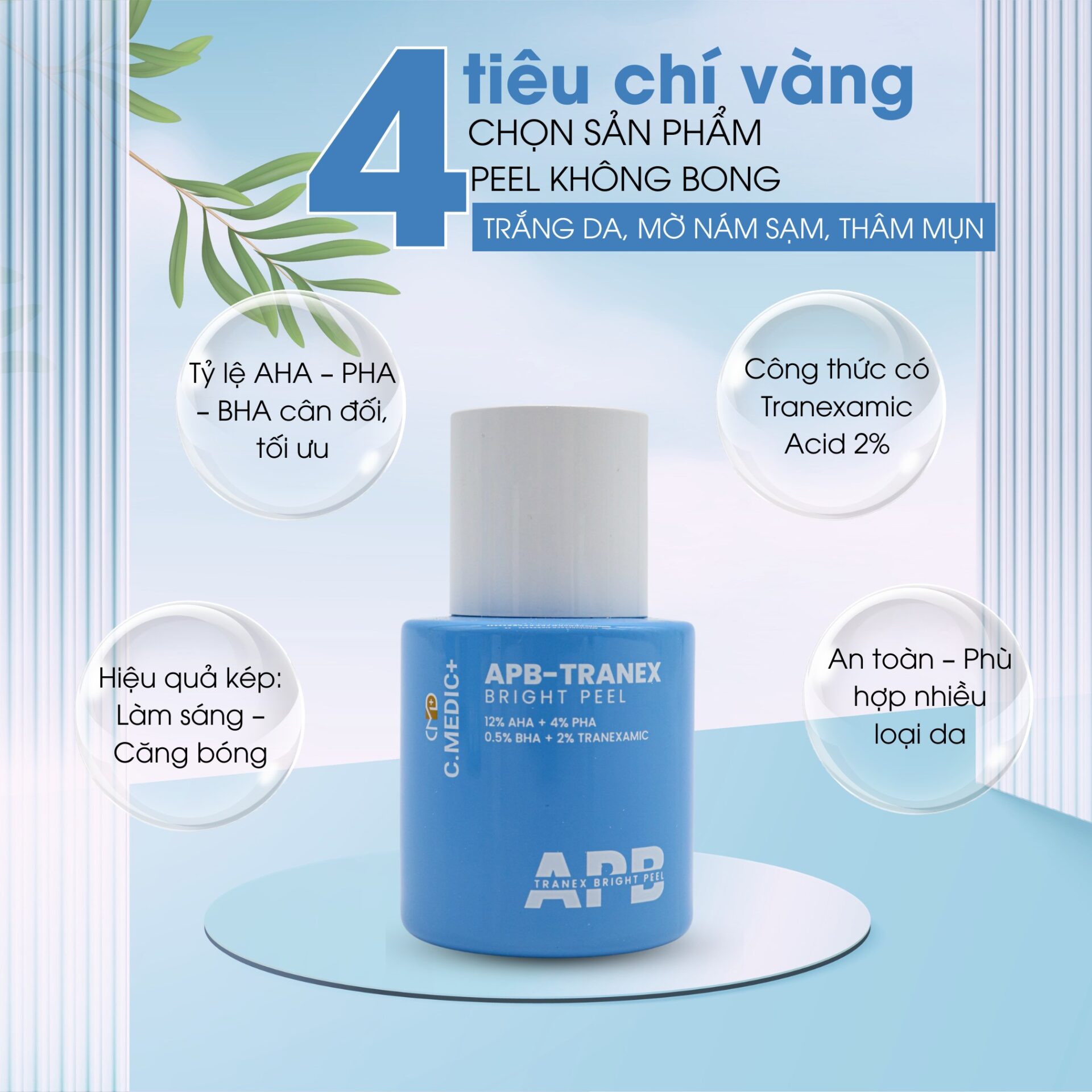 Điểm khác biệt của Apb-Tranex nằm ở sự kết hợp cân bằng giữa bốn hoạt chất chủ chốt: 12% AHA, 4% PHA, 0.5% BHA và 2% Tranexamic Acid. Công thức này không chỉ tập trung vào làm sạch và tái tạo bề mặt da, mà còn hỗ trợ mạnh mẽ trong việc ức chế quá trình hình thành melanin – nguyên nhân trực tiếp gây ra tình trạng thâm, nám và xỉn màu.