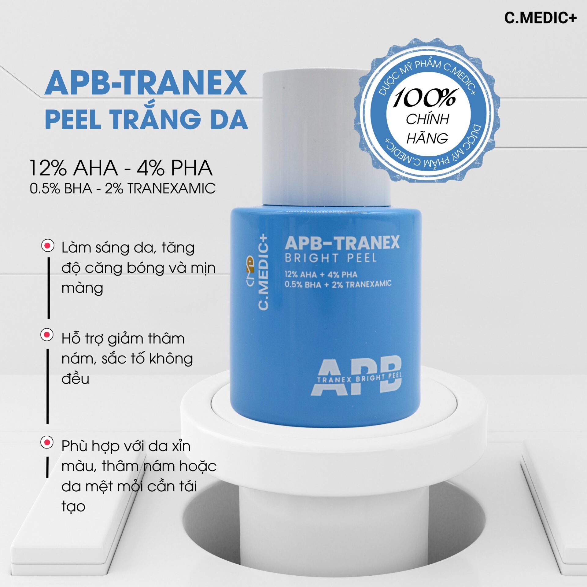 Sạm nám, thâm mụn và tình trạng da xỉn màu không đều luôn là nỗi lo lớn đối với nhiều khách hàng. Trong bối cảnh nhu cầu làm đẹp an toàn, ít xâm lấn và hiệu quả nhanh ngày càng tăng, các giải pháp peel thế hệ mới đã trở thành lựa chọn hàng đầu tại Spa và thẩm mỹ viện. Nổi bật trong số đó là Apb-Tranex, công thức cải tiến kết hợp 12% AHA, 4% PHA, 0.5% BHA và 2% Tranexamic Acid. Sản phẩm không chỉ giúp làm sáng da, cải thiện sắc tố và tăng độ căng bóng, mà còn hỗ trợ phục hồi hàng rào bảo vệ da, hạn chế kích ứng – mang đến liệu trình peel chuẩn y khoa, phù hợp cho nhiều loại da khác nhau.