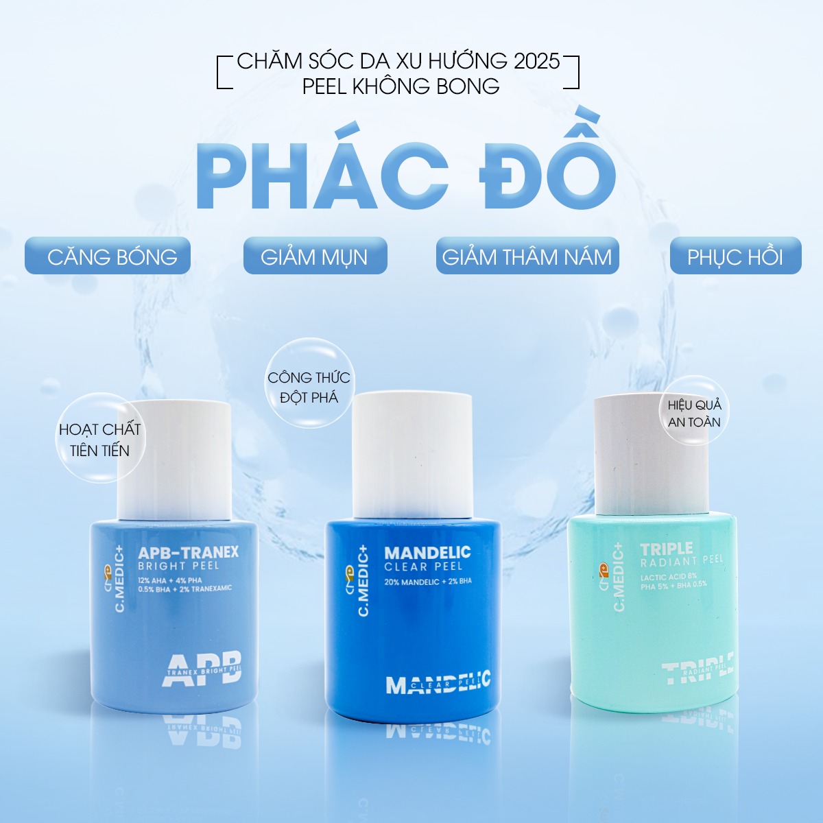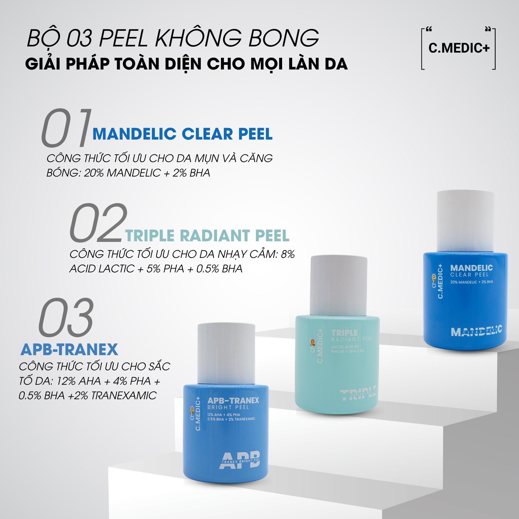 Trong xu thế đó, Triple Radiant Peel, Apb-Tranex và Mandelic Clear Peel được xem là bộ ba công thức peel y khoa nổi bật, mỗi sản phẩm mang một thế mạnh riêng nhưng đều hướng đến mục tiêu chung: làm da sáng khỏe, căng bóng và giảm thiểu nguy cơ kích ứng tối đa.