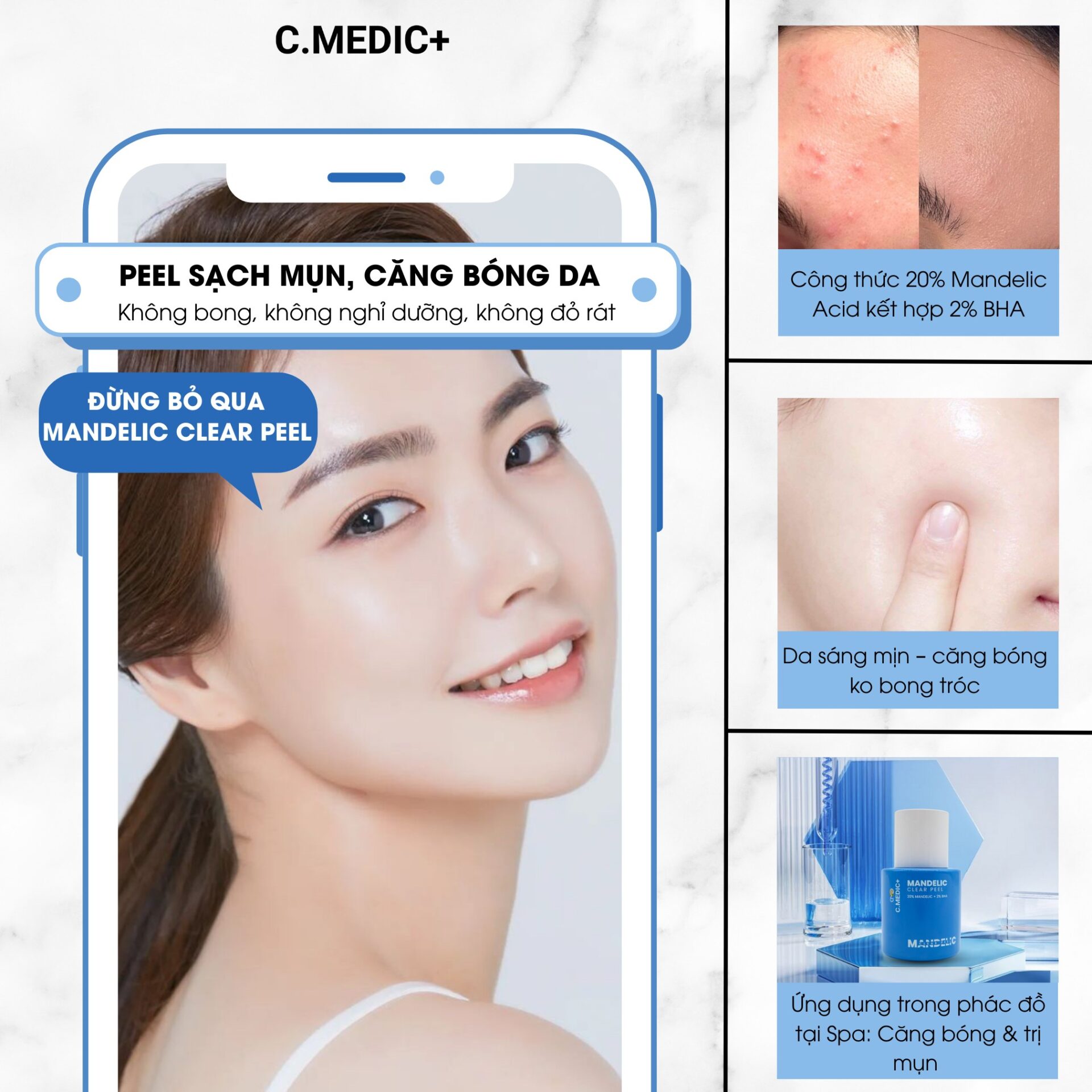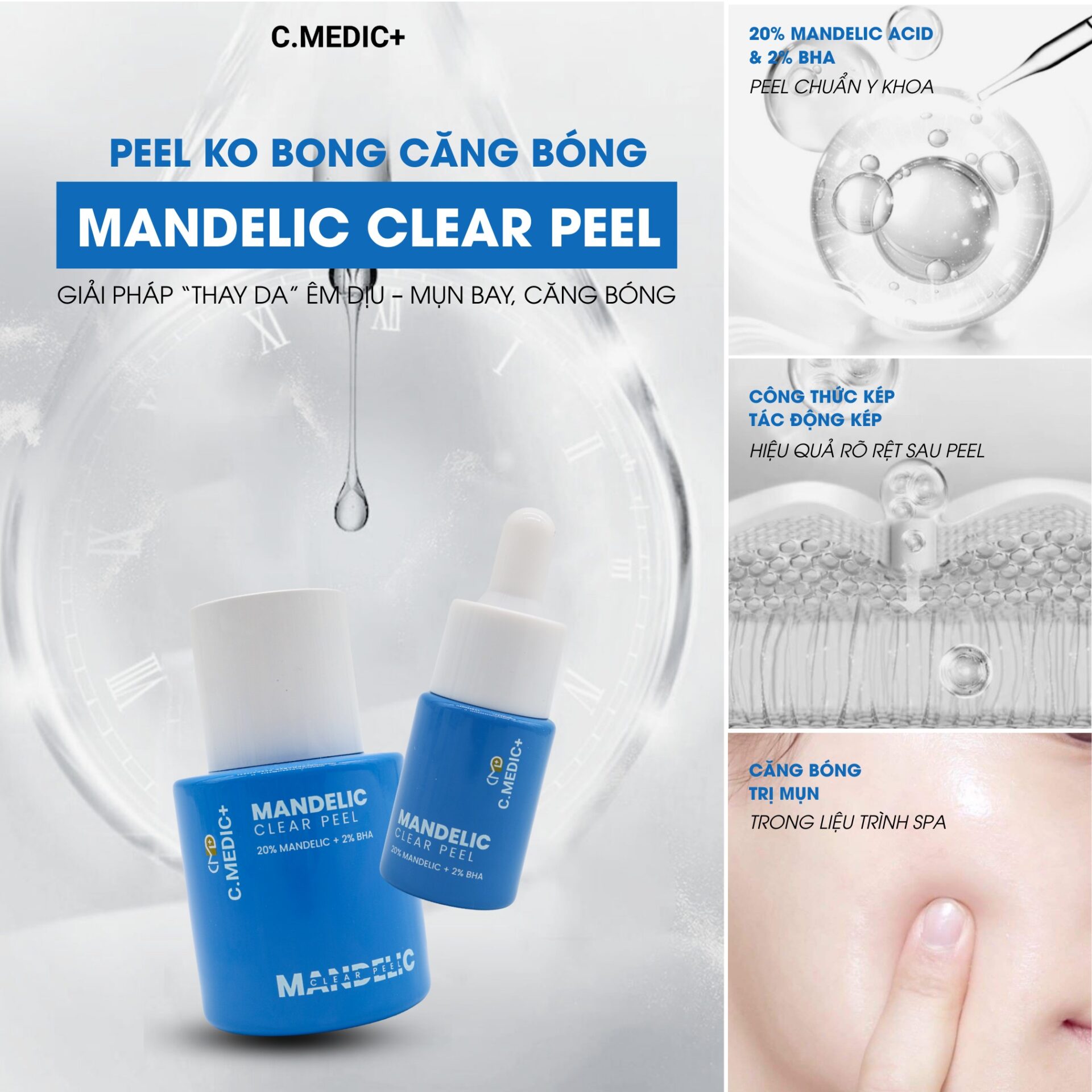 Ứng dụng linh hoạt trong phác đồ spa: Mandelic Clear Peel có thể sử dụng như một liệu pháp chính trong điều trị mụn hoặc kết hợp với các công nghệ khác như ánh sáng sinh học, điện di tinh chất, tế bào gốc… để nâng cao hiệu quả.
