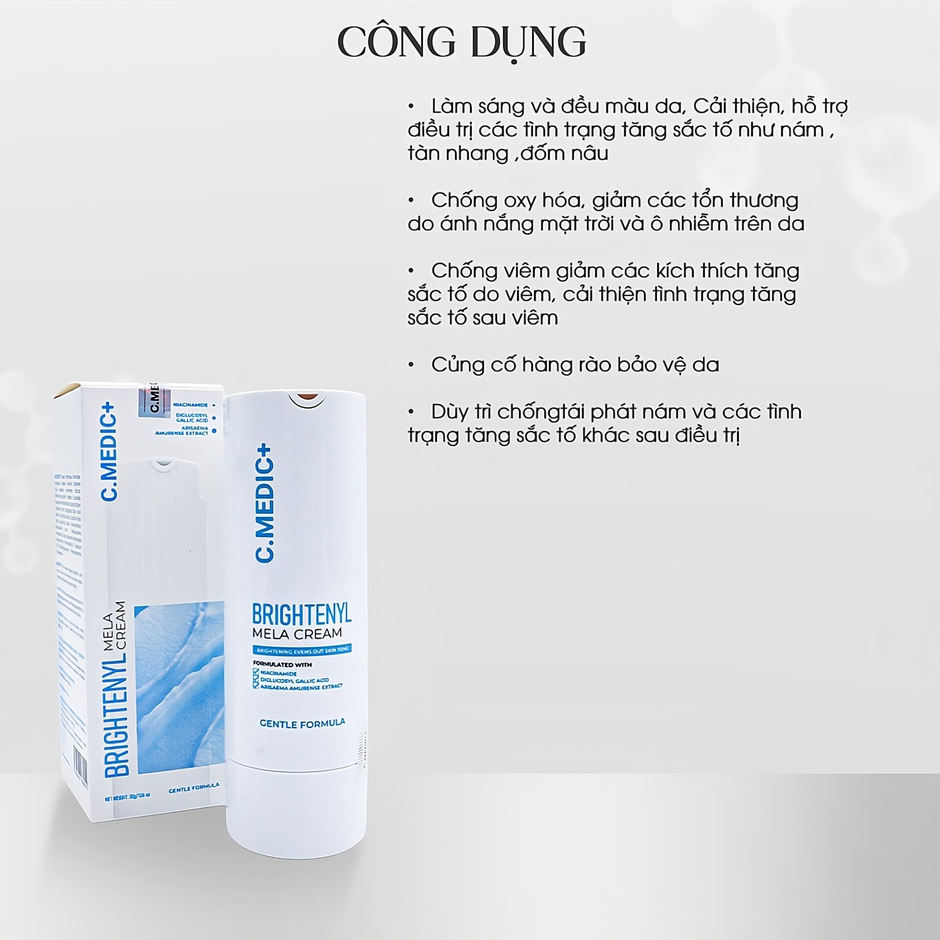 - Làm sáng và đều màu da, cải thiện, hỗ trợ điều trị các tình trạng tăng sắc tố như nám ,tàn nhang ,đốm nâu