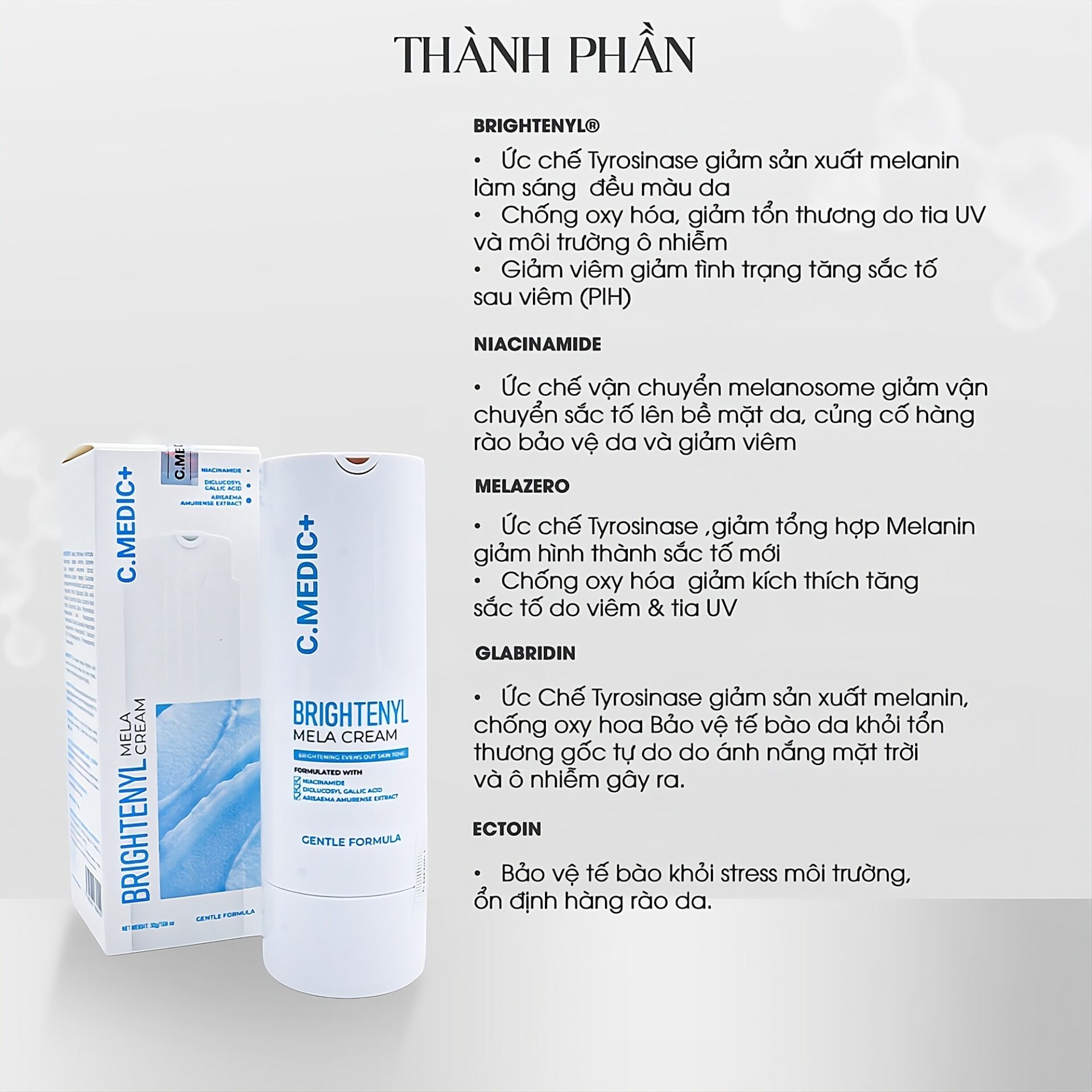 | Melazero | Ức chế Tyrosinase ,giảm tổng hợp Melanin giảm hình thành sắc tố mới Chống oxy hóa giảm kích thích tăng sắc tố do viêm & tia UV |